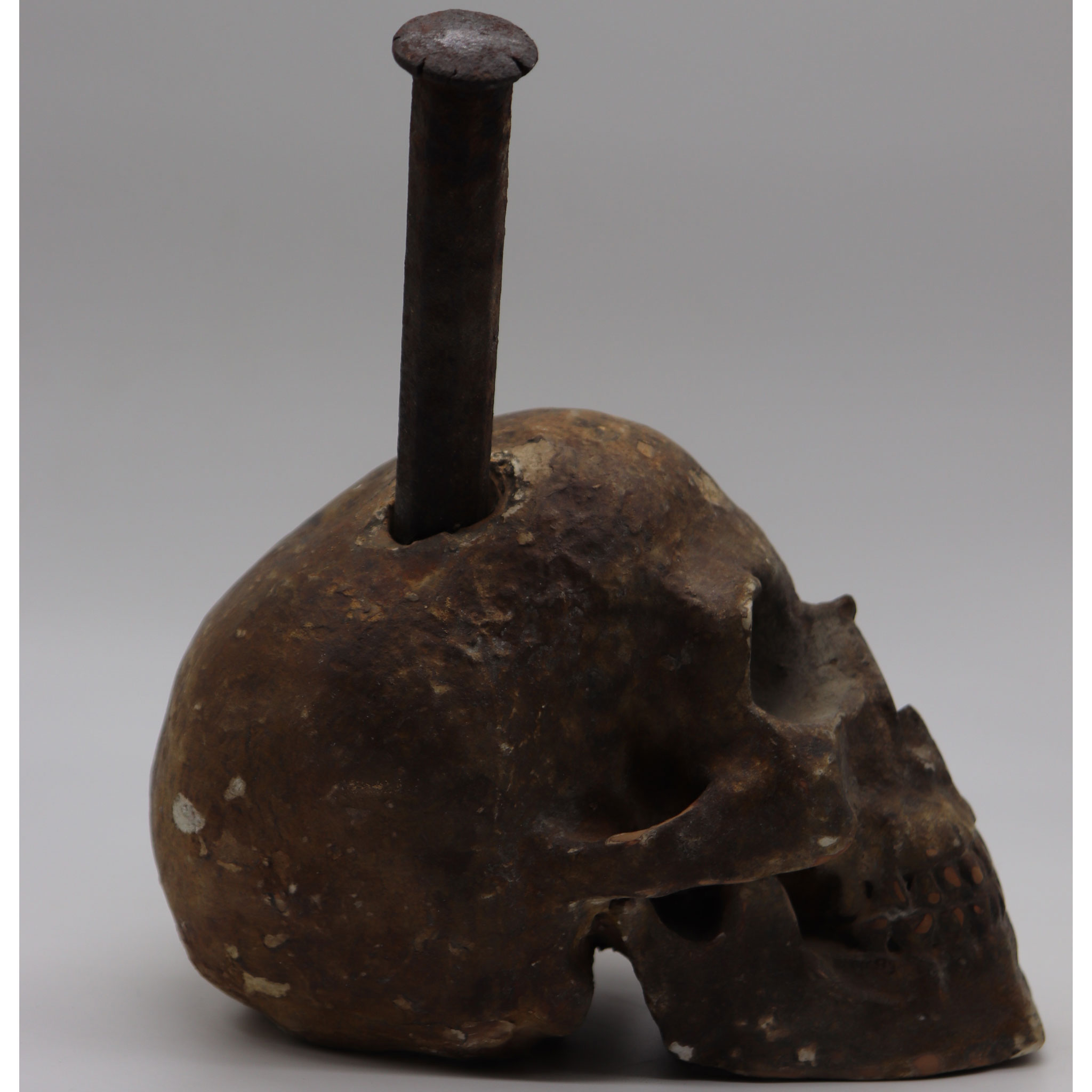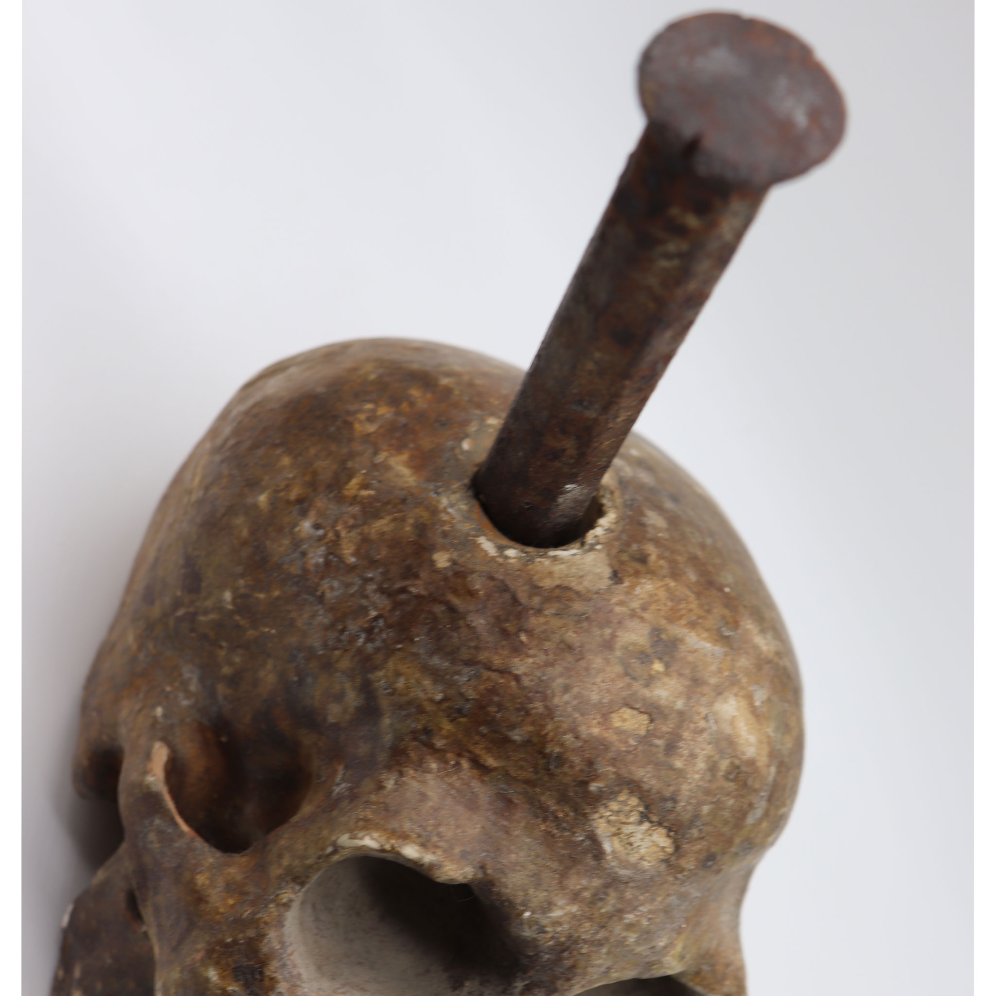 L’enorme chiodo di metallo si presenta conficcato con veemenza all’interno del teschio, ben radicato e difficile da rimuovere, proprio come le assillanti ossessioni che assediano la psiche dell’uomo contemporaneo, incapace di scacciarle e venendone sopraffatto e corrotto.