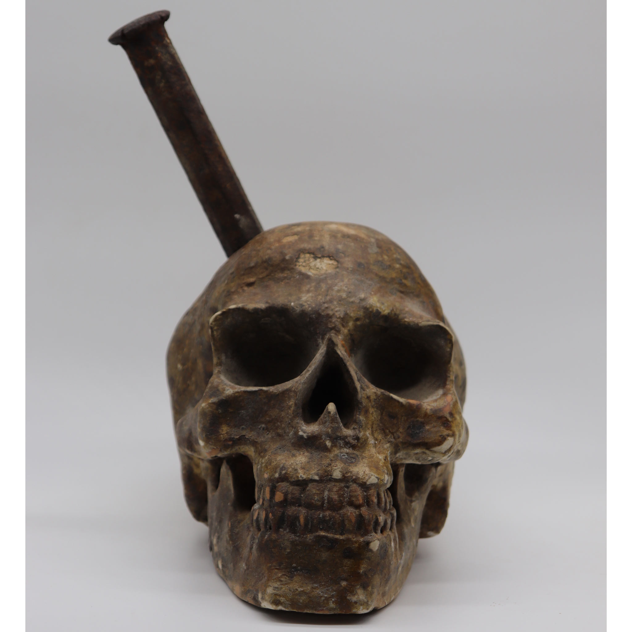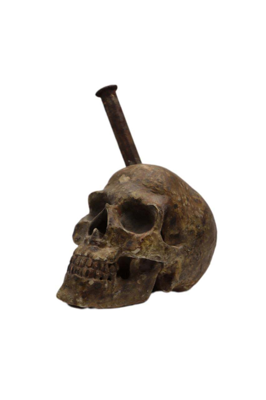 The huge metal nail is vehemently driven into the skull, well rooted and difficult to remove, just like the nagging obsessions that besiege the psyche of contemporary man, unable to drive them away and being overwhelmed and corrupted.The skull is rendered in a worn, dirty way, precisely to represent this corruption of the psyche while the grin expresses the deception suffered, the illusion of happiness to be achieved once one’s obsession is satisfied.In conclusion, the work conveys the idea of ​​ephemeral and transient life, corrupted by the pursuit of one’s obsessions that take root in the human mind masquerading as the pursuit of happiness.